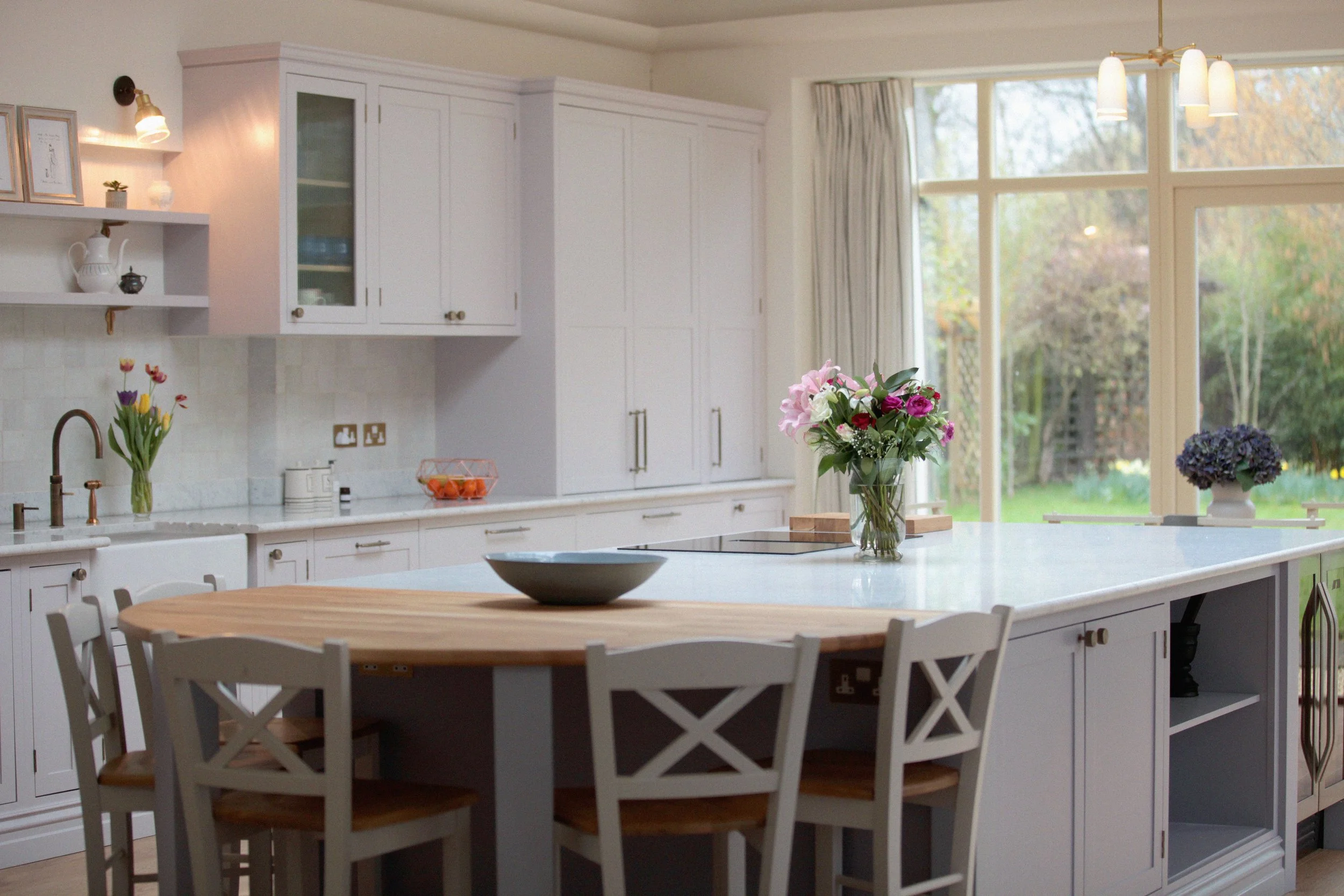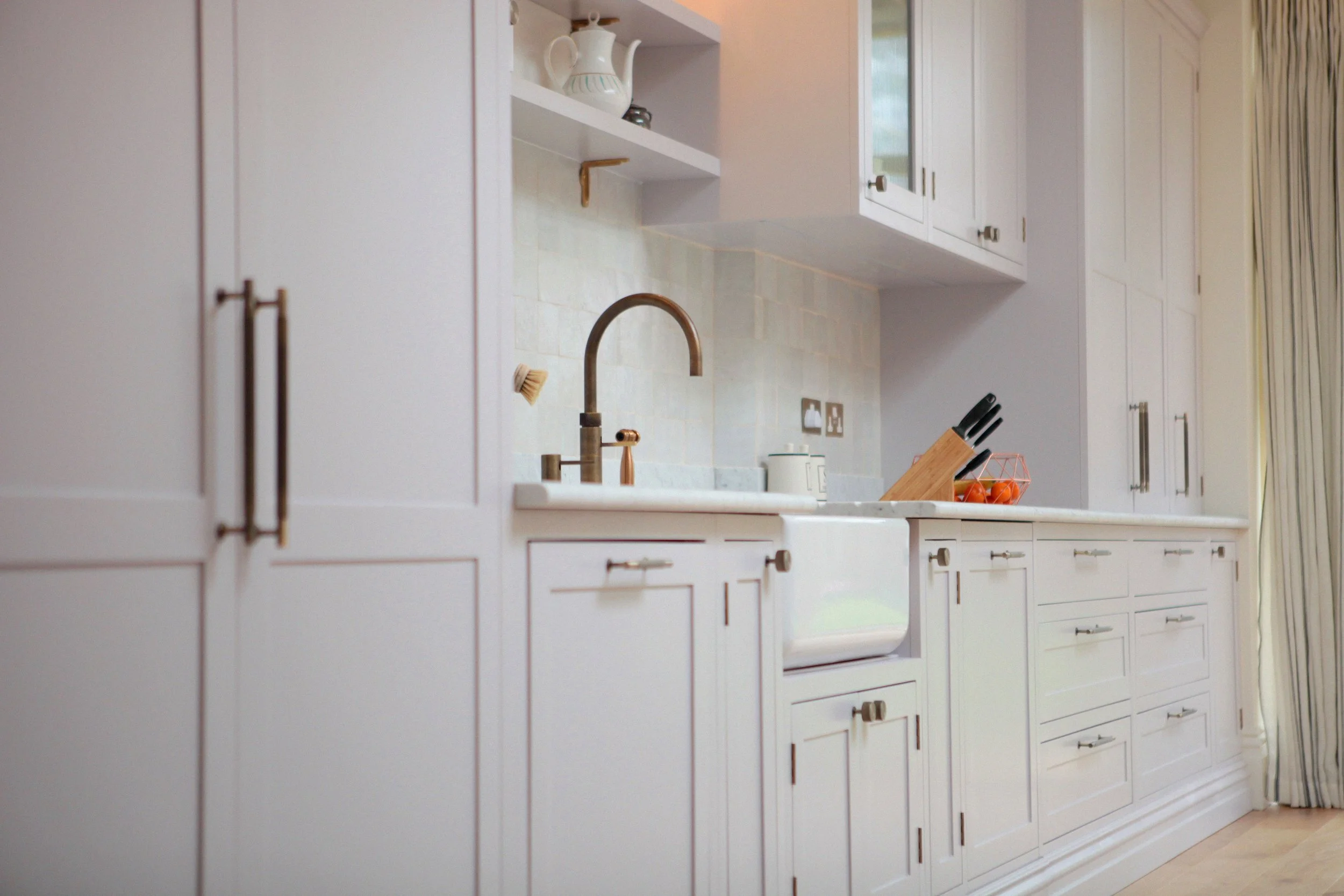 This airy, open kitchen sits at the heart of a farmhouse near Guildford, designed for a family who loves to gather, cook and share life together. A large marble and oak island anchors the space, offering both a prep zone and a place to perch. Off-white cabinetry lines the U-shaped layout, while oak shelving and a tiled splashback add warmth and texture. Soaring ceilings give the room a sense of calm and openness — ideal for modern rural living.